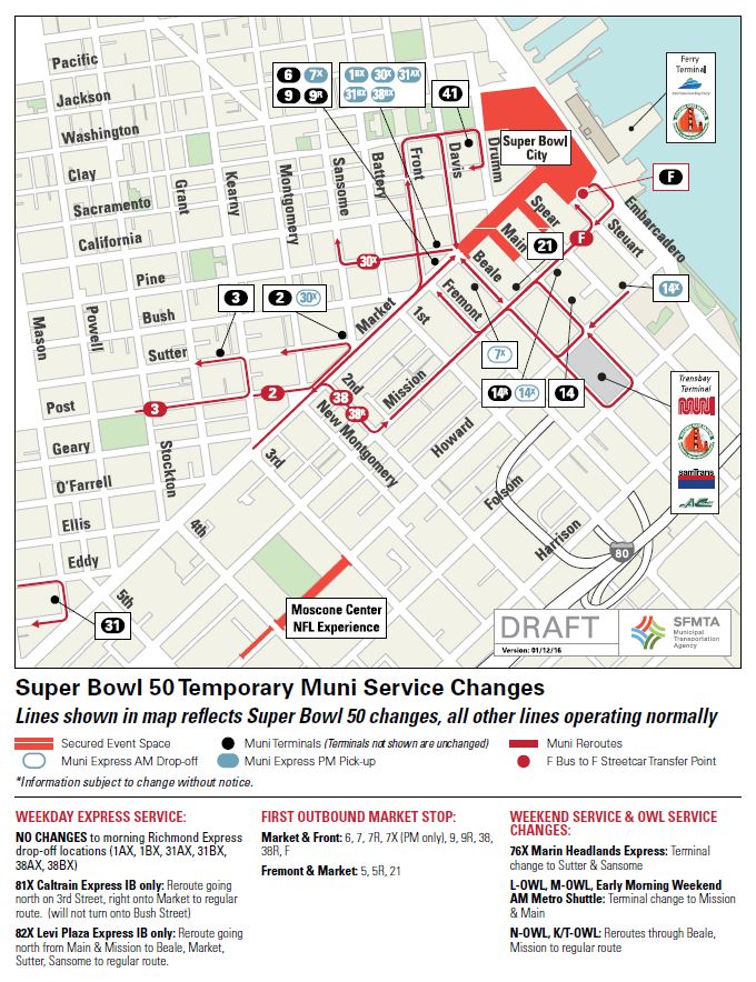 If you’re going to Super Bowl City, which runs January 30 until game day, pay us a visit. We’re just outside the secure area. (In case you’re just joining us, this corporate extravaganza (for which SFMTA and other city agencies are not being reimbursed by the NFL) is taking over the easternmost three blocks of Market Street, plus several blocks of The Embarcadero’s southbound traffic lanes, for a total of three weeks, counting set up and tear down time.