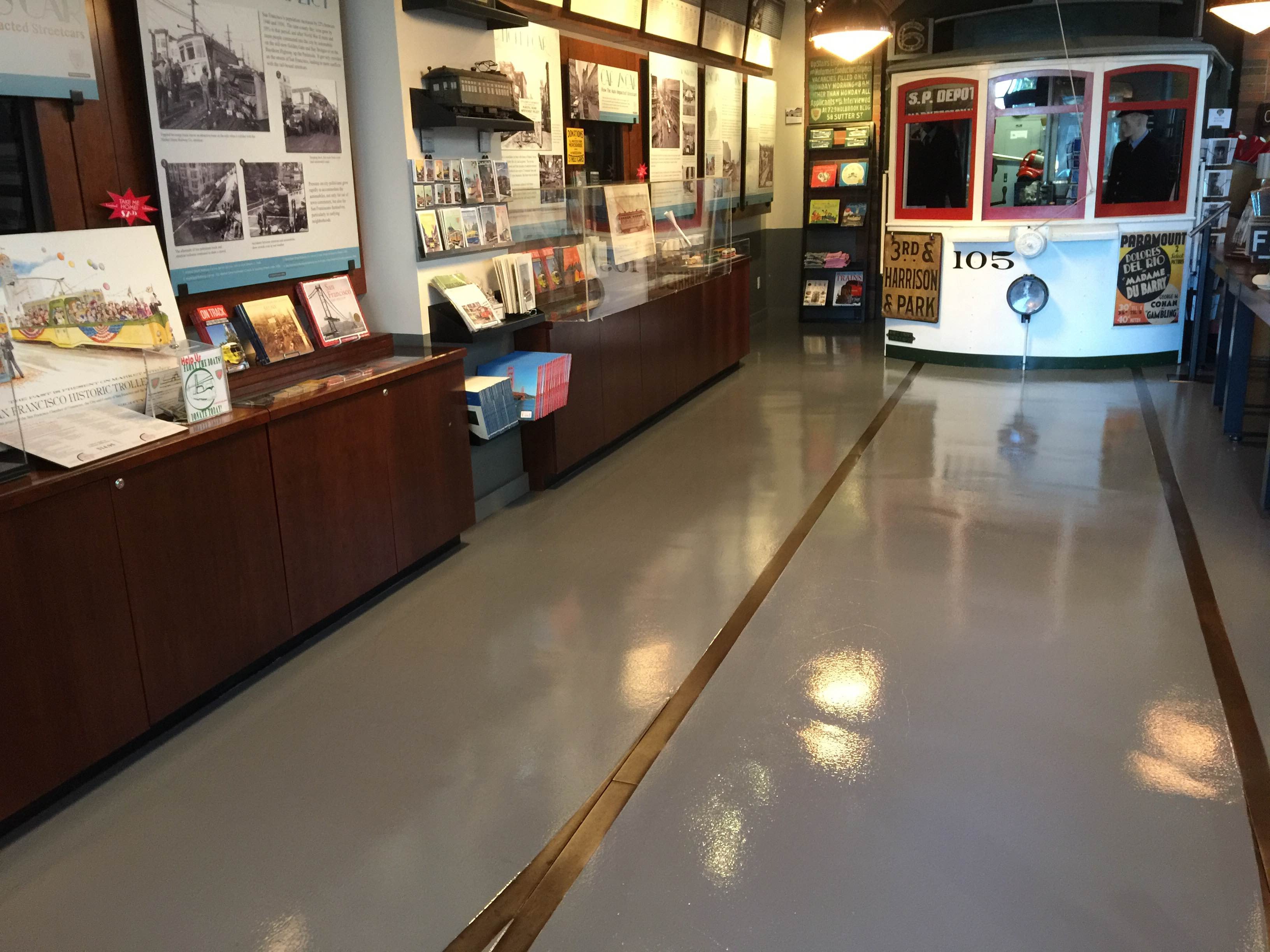 We’ve just completed the sealing process on the floor of our San Francisco Railway Museum and it looks fabulous. Yes, those are replica tracks embedded in the “street,” with a “switch” visible at the bottom to take you right to the check-out counter.