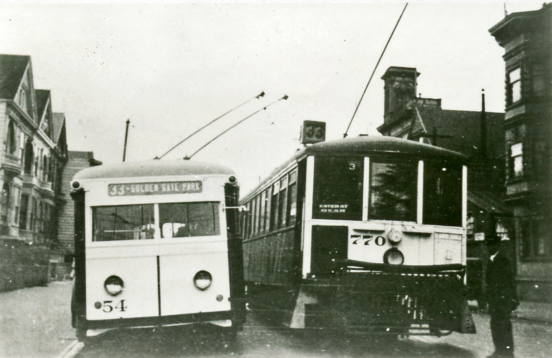 By the mid-1930s, motor buses could go anywhere in San Francisco there were streets—if they weren’t too steep). But electric trolley buses could climb virtually any hill; could use the same power generated for streetcars, and didn’t need tracks in the street. Market Street Railway converted its 33-Ashbury line through the Mission and over Twin Peaks into the Haight-Ashbury to trolley buses in 1935, followed by Muni with its first line, the R-Howard-South Van Ness in 1941. Muni planned to convert the E-Union streetcar line to trolley buses as well, but World War II intervened.