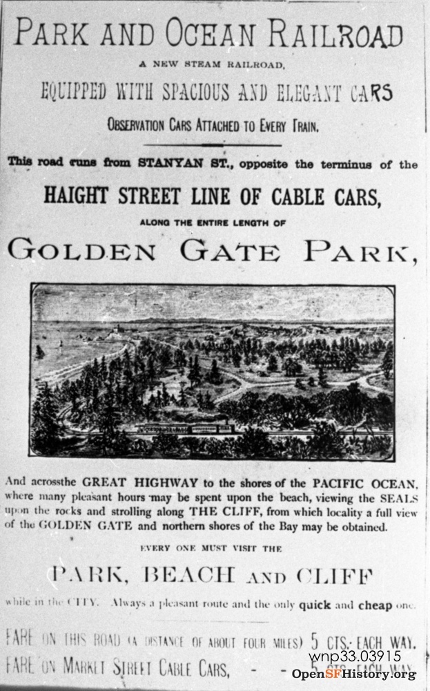 That same year, 1883, Southern Pacific interests, including Leland Stanford, effectively extended their Haight Street cable line westward by opening the Park and Ocean Railroad, using a steam train, from the Stanyan Street turntable to the doorstep of the already popular Cliff House. The steam line followed H Street/Lincoln Way almost to Ocean Beach, then turned north through the western edge of Golden Gate Park into the outer Richmond District, ending at B (Balboa) Street. The first weekend, 10,000 people reportedly rode that steam train to the beach. (San Francisco historian Gary Kamiya has a wonderful write up on the backstory of the Park & Ocean, linked here, but behind a paywall for some.)