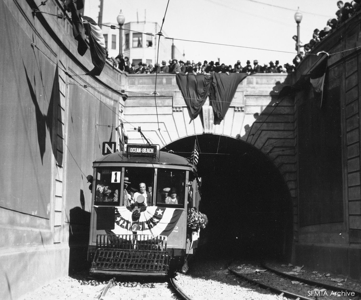 For ‘can-do’ City Engineer M.M. O’Shaughnessy, that encouragement fit right in with his own vision. In 18 months, he holed through one of the longest streetcar tunnels ever built, from Castro and Market under Twin Peaks to the middle of nowhere. When it opened on Feb. 3, 1918, with Mayor ‘Sunny Jim’ Rolph at the controls of gray-and-maroon car No. 117, 10,000 turned out to cheer. Here’s a comprehensive look at how the Twin Peaks Tunnel came to be.