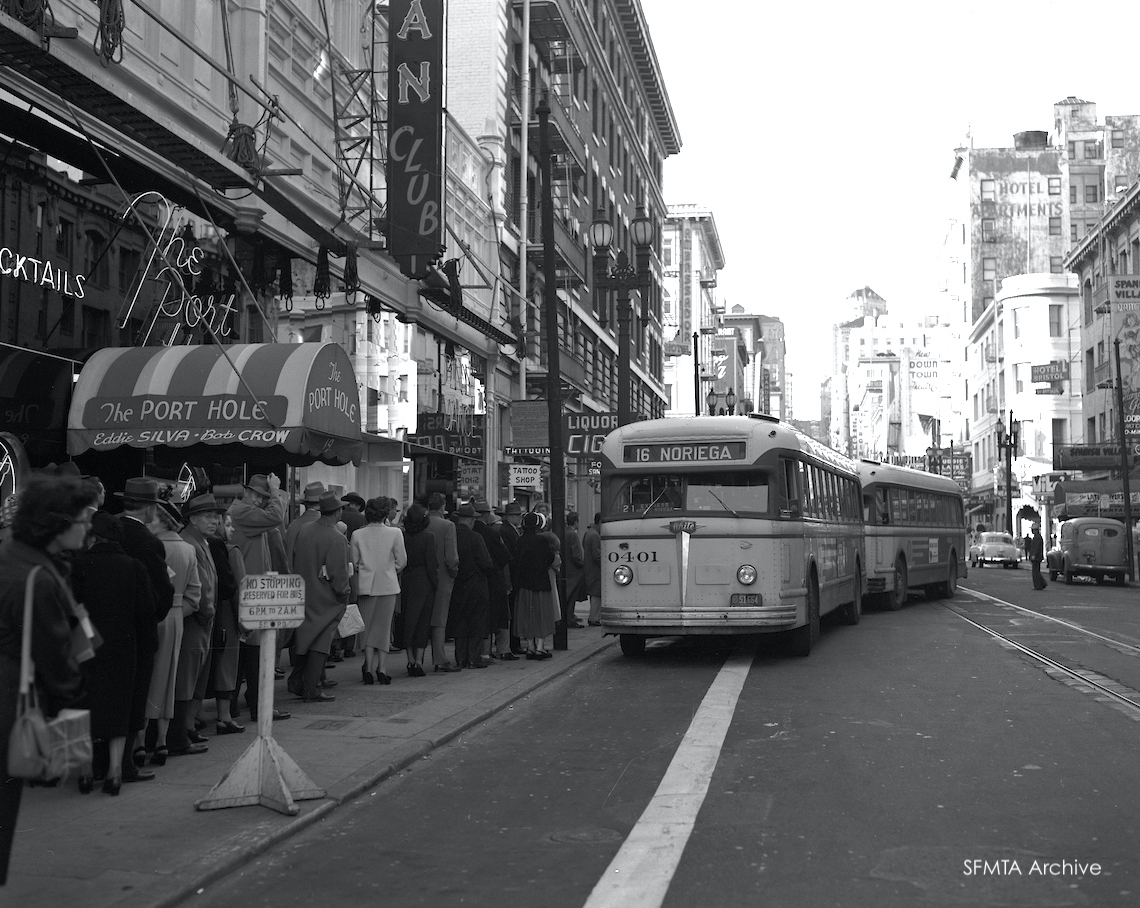 Lack of money blunted Muni’s expansionist fervor, though. After the takeover of Market Street Railway in 1944, Muni could have rebuilt the worn-out track of MSRy’s 7, 12, and 17 lines and routed them through the Muni tunnels to speed those lines’ riders downtown. But voters had only funded purchase of the MSRy’s decrepit assets Instead, Muni ripped out the tracks and either discontinued parts of the routes or put buses on. Nor did Muni leverage its tunnel investment by adding additional lines on streets built extra wide to accommodate transit, such as Noriega.