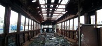 Interior of PCC No. 1009, vandalized and burned by homeless, leaving San Francisco for restoration, 2010.
