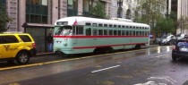 PCC No. 1073, honoring El Paso-Juarez, on its first day of F-line service on lower Market Street, November 28, 2012. Jeremy Whiteman photo. Click to enlarge.