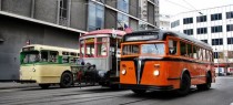 Three of the vintage Muni vehicles that will carry passengers November 2-3 for Muni Heritage Weekend. From left, 1950 Marmon-Herrington trolley coach No. 776, 1912 streetcar No. 1, and 1938 White motor coach No. 042. Click to enlarge.