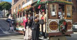 ‘Tis the season to show off holiday spirit in all kinds of ways. The San Francisco Chronicle is both reporting and demonstrating that spirit with our most iconic transit vehicles, the cable cars. You can see the publication’s handiwork on Powell Cable Car 1 (pictured in the photo by Val Lupiz above, complete with Victorian-costumed guests), one of eight cable cars decorated this year in a growing campaign led by Val, Jeremy Whiteman, and Frank Zepeda (MSR members all), and supported by Market Street Railway.