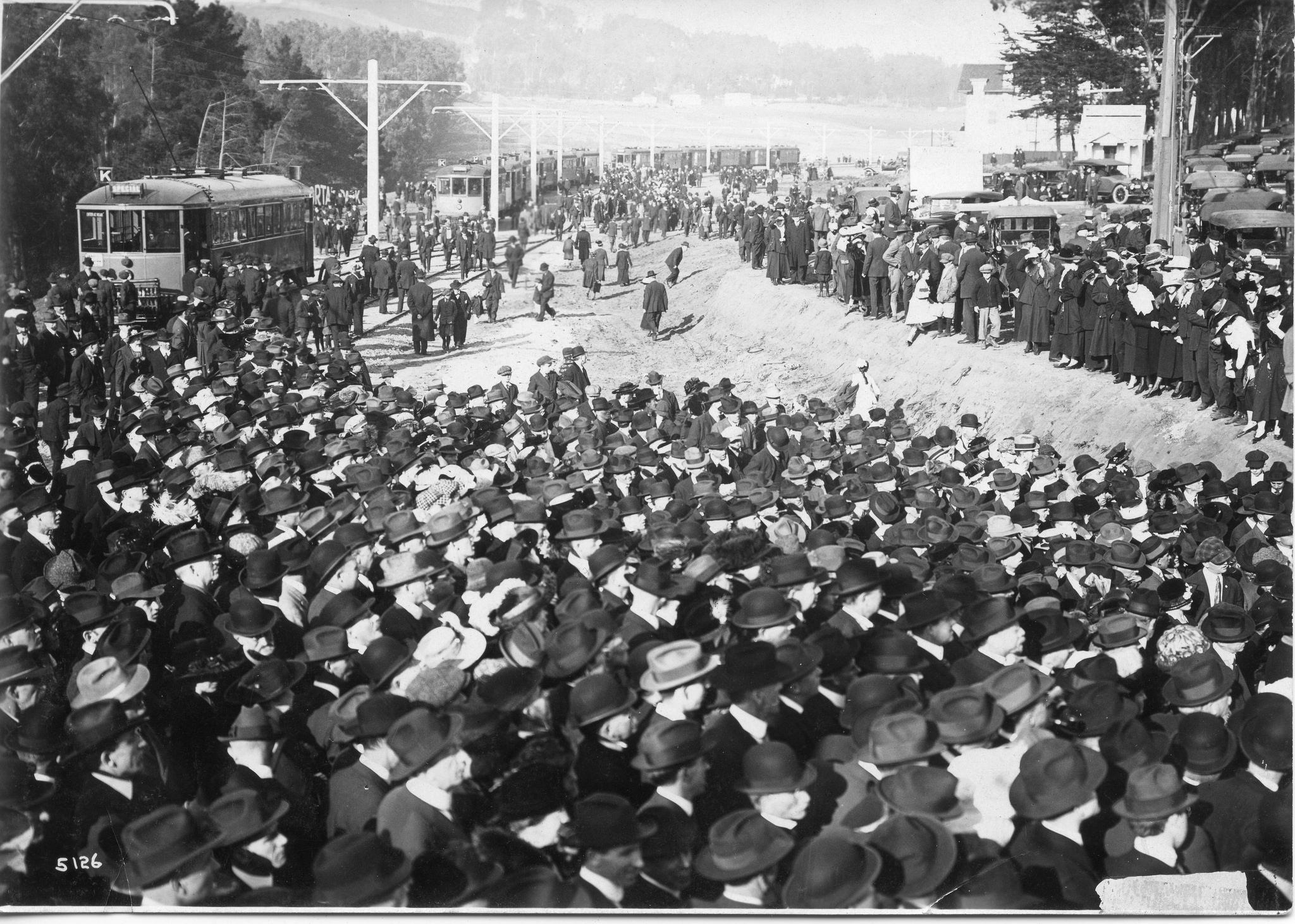 The opening of the Twin Peaks Tunnel February 3, 1918, brought mobs of San Franciscans way out west to St. Francis Circle, which was as far as the Muni K-line went then. (The crowd is listening to Mayor Rolph speak, out of frame to the right.) Soon, an agreement would be reached with United Railroads to extend the K over its Ocean Avenue tracks. SFMTA Archive