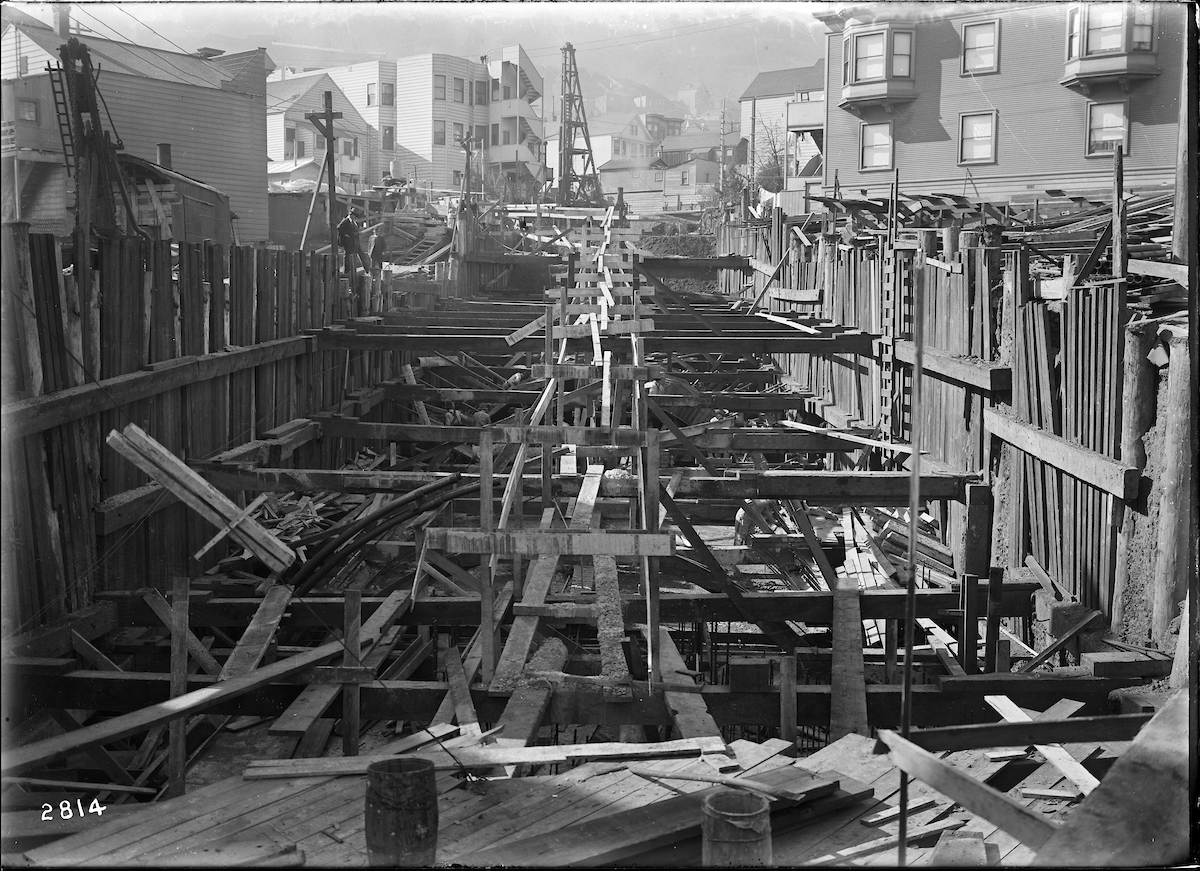 Construction on the tunnel started at the end of 1914, clawing through the very soft ground near Castro, which caused the eastern end of the tunnel to be built with a “cut-and-cover” method. A small station was built at Eureka Street, just inside the Castro portal, even though there was a surface stop at Castro. O’Shaughnessy wanted to make it easy to connect the tunnel to a future streetcar subway under Market Street, which he was confident would have to be built soon. As this part of the tunnel was completed, with each track in its own concrete box, new streets were created above, including an extension of Market Street and a short street, Storrie, which the tunnel’s contractor named after himself.