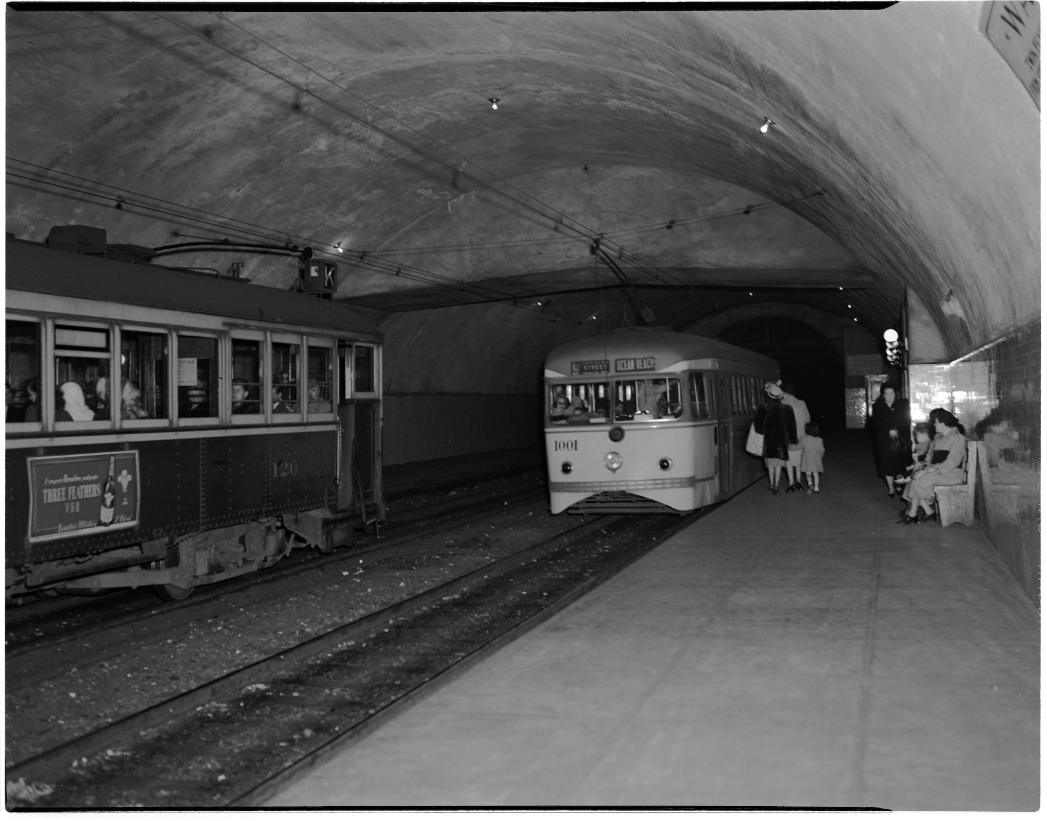 The 12,000-foot Twin Peaks Tunnel was the longest streetcar tunnel in North America until eclipsed in 1998 by the Robertson Tunnel in Portland. The original West Portal of the tunnel was monumental, dominating the new neighborhood shopping street named for it. That imposing façade was demolished in the 1970s to build a station inside, when the long-wished-for subway under Market Street was finally built and connected to the tunnel at Castro. (That connection wiped out the Eureka Street Station, whose ghostly platforms can still be seen by riders traversing the tunnel.)