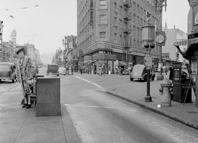 Here’s an unusual shot, photographer unknown (at least to us). We’re at Market and McAllister, looking west. It appears to be about 1940. When our main drag had four streetcar tracks side by side, there were very few spots where there was enough room to build actual boarding islands like you see on Market now. Instead, there were just raised dots to mark what were optimistically called “safety zones”.