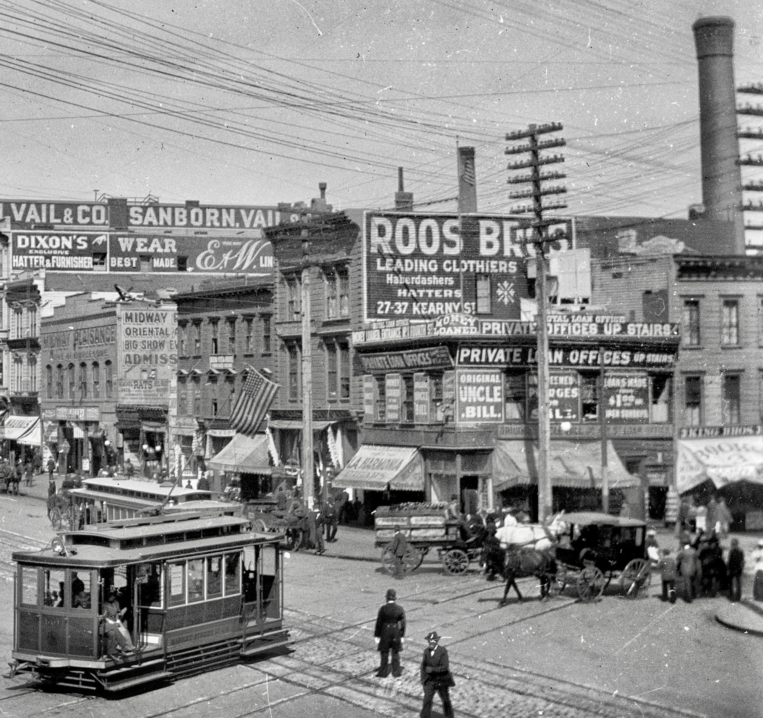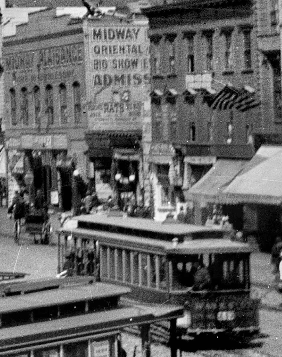 In the close-up below, we see that the dinky is crossing behind a green Hayes Street cable car (later the 21-Hayes streetcar and then trolley bus), which is about to pass an establishment called “Midway Plaisance, Home of Burlesque” on its route to the newly-opened Ferry Building. First, though, it will roll past a small shop with a sign on its roof that says RATS in big letters and ROACHES, ANTS, and BEDBUGS in smaller ones. Really wish we could read the rest of it but we presume it’s an extermination business, located where the landmark Humboldt Bank Building rose a few years later.
