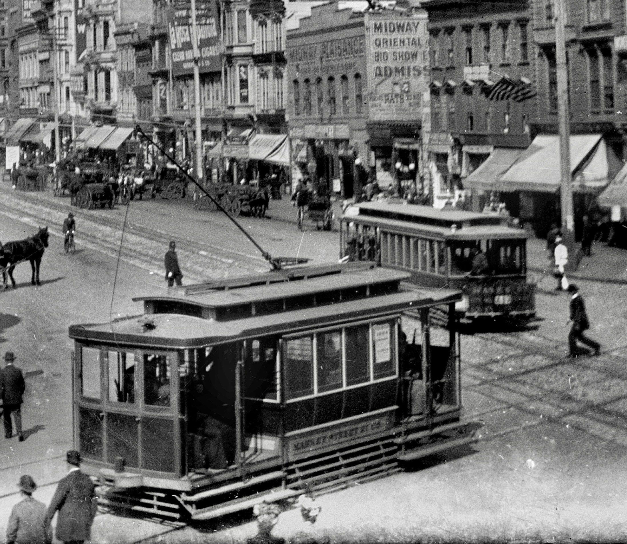 In the crop at the top of the post, we see a dinky identical to Muni’s Car 578, built in 1896, crossing Market from Ellis to Fourth Street, headed south to the Southern Pacific Train Depot. (We can’t make out the full car number, though it doesn’t appear to be 578 itself but rather another in the bright-yellow fleet of Ellis-O’Farrell line cars, all built by Hammond, which also built many of the California Cable Cars still in Muni’s fleet today.)