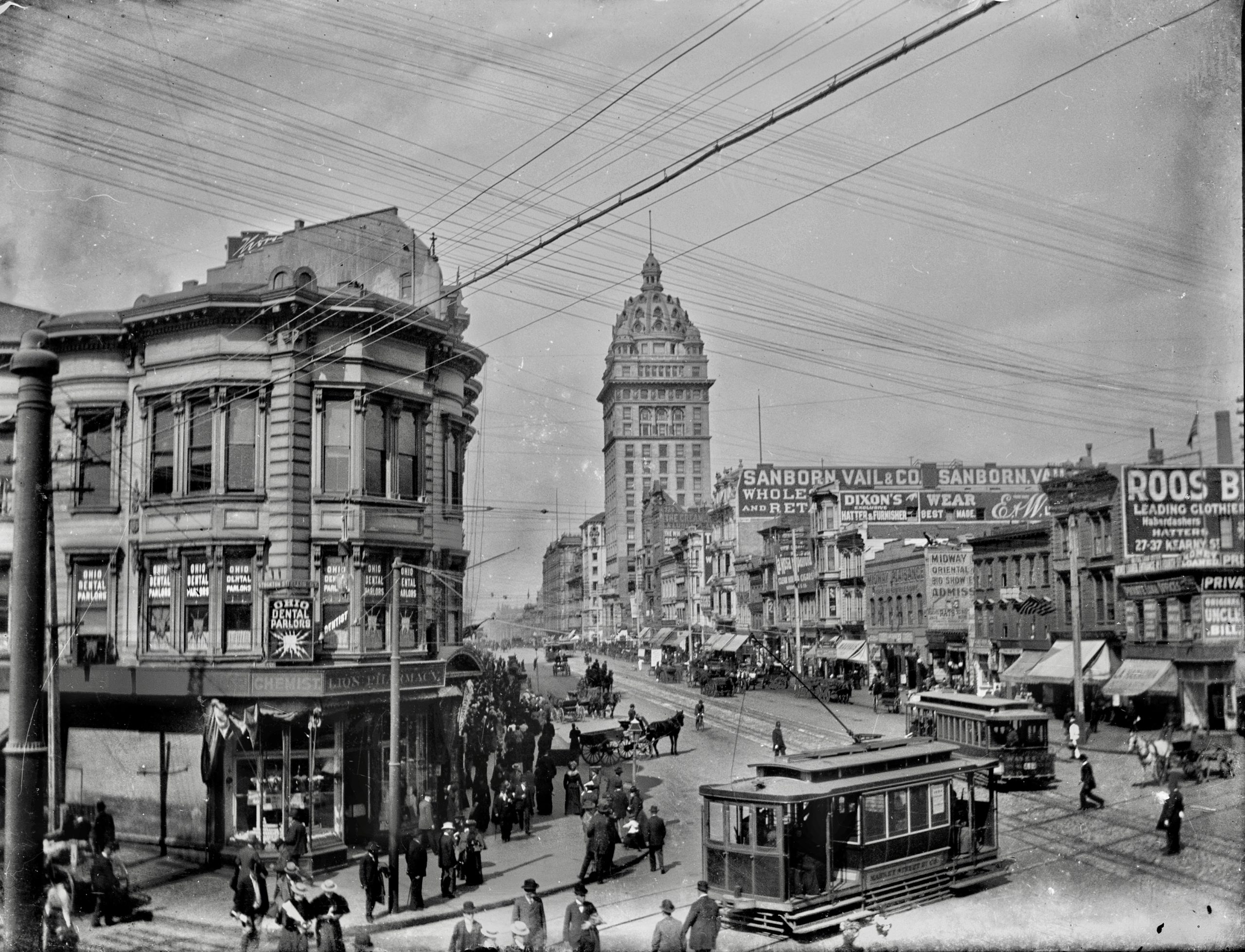Two photographic glass plates recently found by Howard Jarvis (no, not the author of Prop. 13 for those who remember back that far) appear to make the dinkies central to the composition. The two photographs were clearly taken by the same photographer, probably within a few minutes of each other, from the same place, the second floor of a building at Ellis and Market, looking southeast across to Fourth Street. Based on other photos of the same intersection, these shots were taken between 1898 and 1900. One photograph is shifted a little to the right from the other one. We include several crops and a full image here.